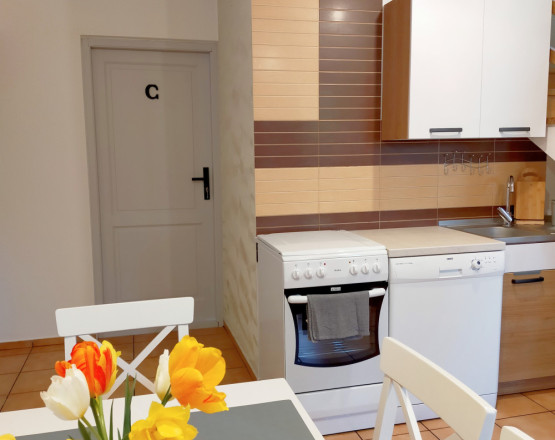 - Wspólny aneks kuchenny z pełnym wyposażeniem (lodówka, kuchenka, naczynia, czajnik elektryczny) dla gości.