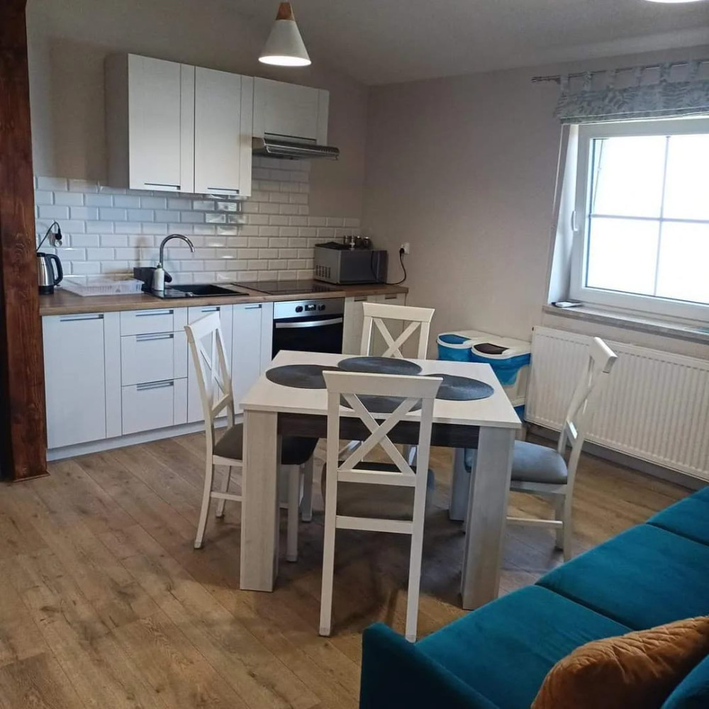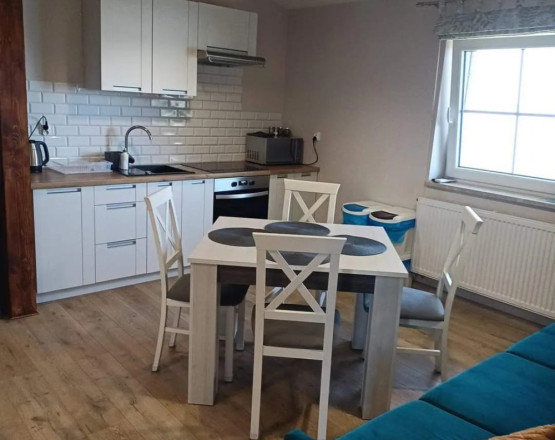 - salon z aneksem kuchennym to przestronne pomieszczenie, w którym znajduje się wygodna, kanapa z funkcją spania, telewizor, stół wraz z krzesłami oraz w pełni wyposażona kuchnia (kuchenka indukcyjna, piekarnik, mikrofalówka, lodówka, czajnik, zastawa stołowa, sztućce, garnki, kubki itp.).
