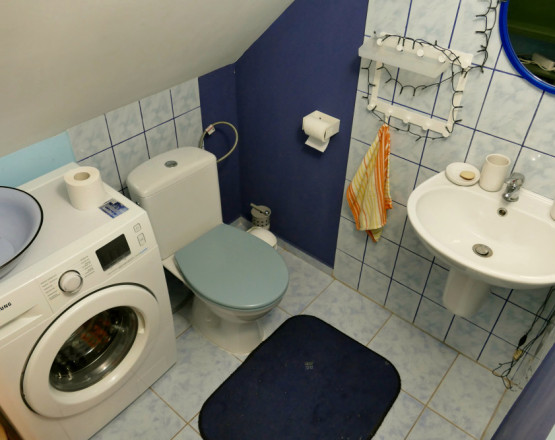 Na parterze domku jest salon z aneksem kuchennym (wyposażony w naczynia i podstawowe urządzenia, w tym zmywarkę i płytę indukcyjną), oraz łazienką (prysznic, toaleta, umywalka). Na górze łazienka (ubikacja, umywalka, pralka) oraz dwa pokoje, w każdym łóżko dwuosobowe plus tapczanik jednoosobowy. Zapewniamy pościel i ręczniki.