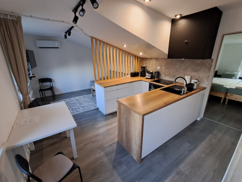 - duży salon z otwartą kuchnią, w pełni wyposażoną m. in. w: lodówkę, zmywarkę, ekspres do kawy.
