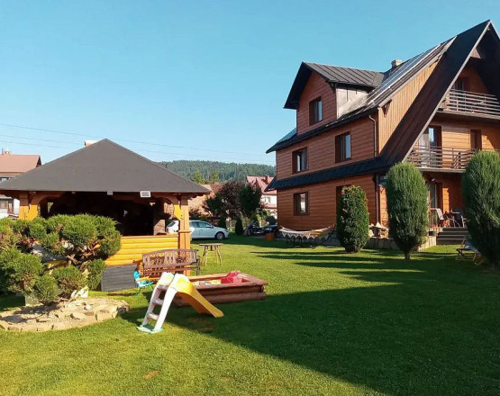 - Plac zabaw dla dzieci: huśtawki, zjeżdżalnia, domek i piaskownica z zabawkami.