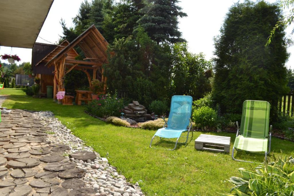 Rozległy, zielony ogród z miejscem na odpoczynek