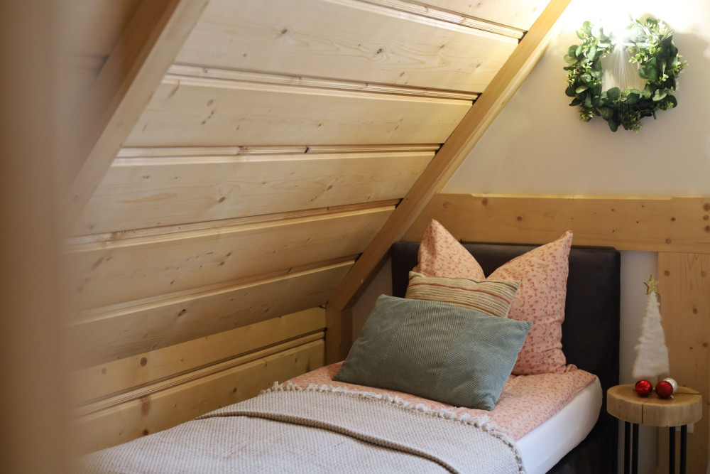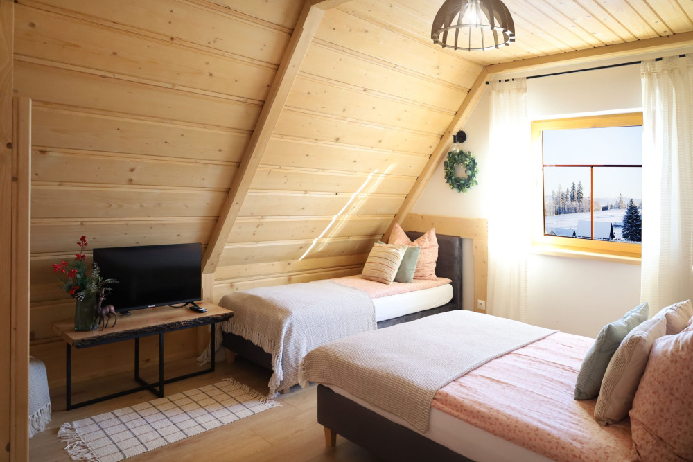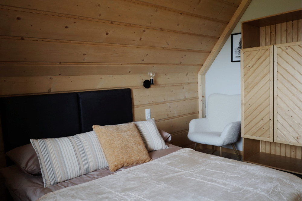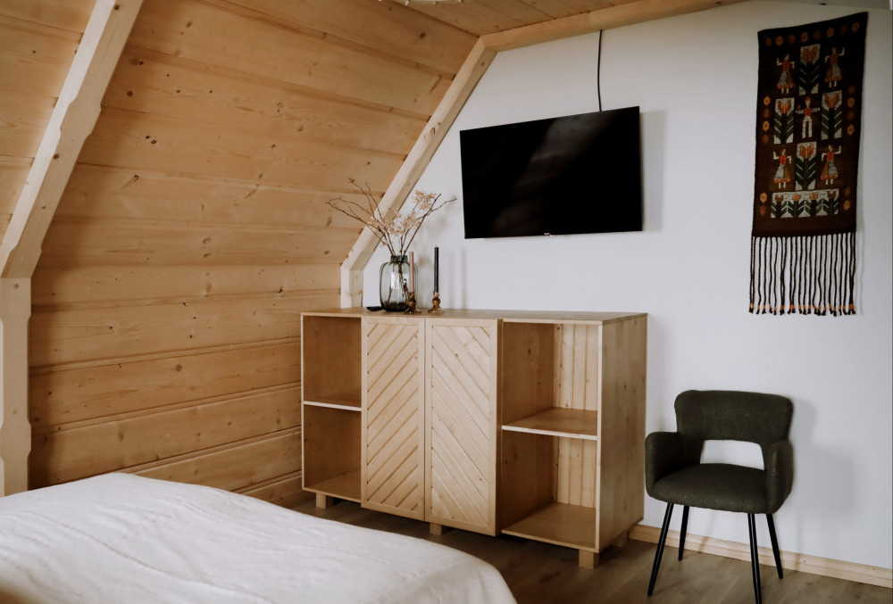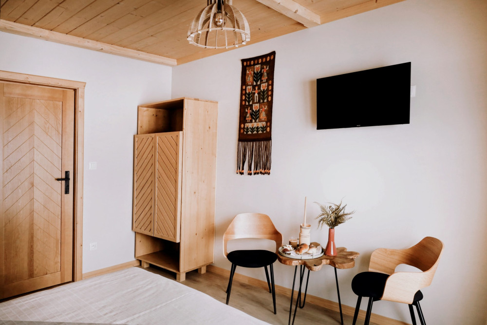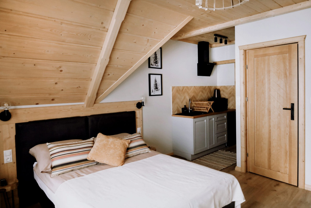 APARTAMENT 3 – ZAWRAT (23 m²) przytulny z jedną sypialnią, o kameralnym charakterze, również wynajmowany na wyłączność. Z okien rozciąga się widok na Tatry i Babią Górę.