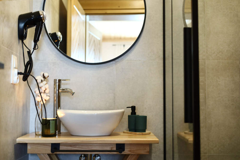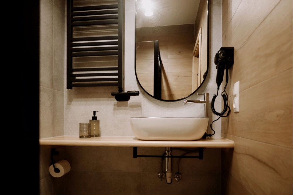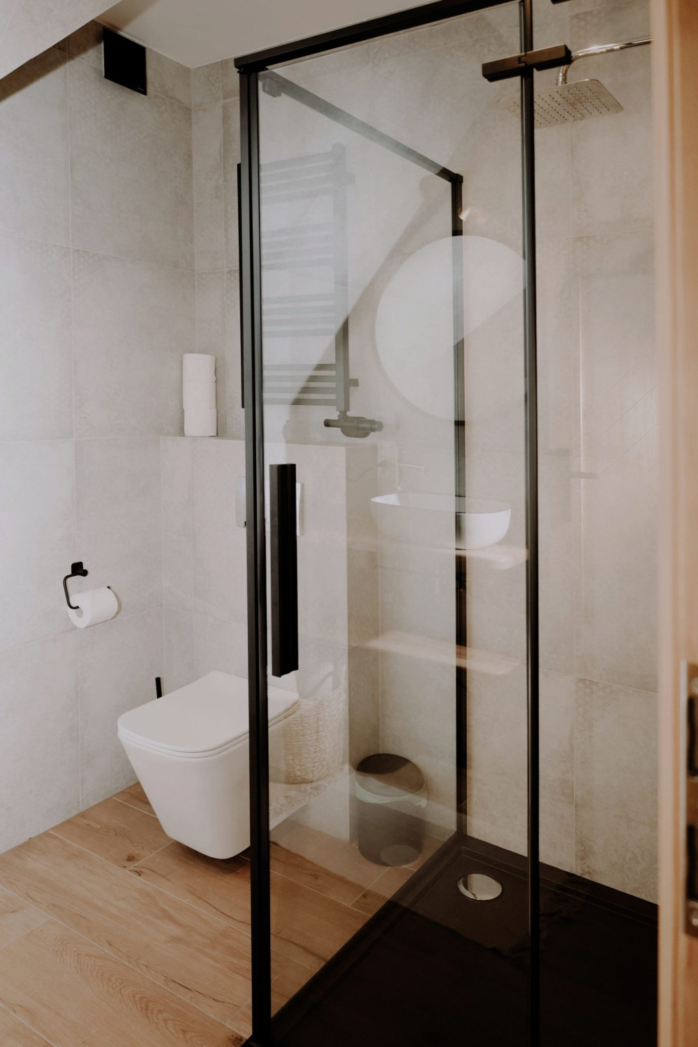obszerna łazienka z prysznicem, pełnym węzłem sanitarnym, ręcznikami oraz suszarką do włosów.