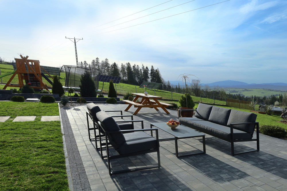 APARTAMENT 1 – RYSY (74 m²) największy z naszych apartamentów – z dwiema sypialniami, dwiema łazienkami i kuchnią. Z okien roztacza się widok na Gorce.