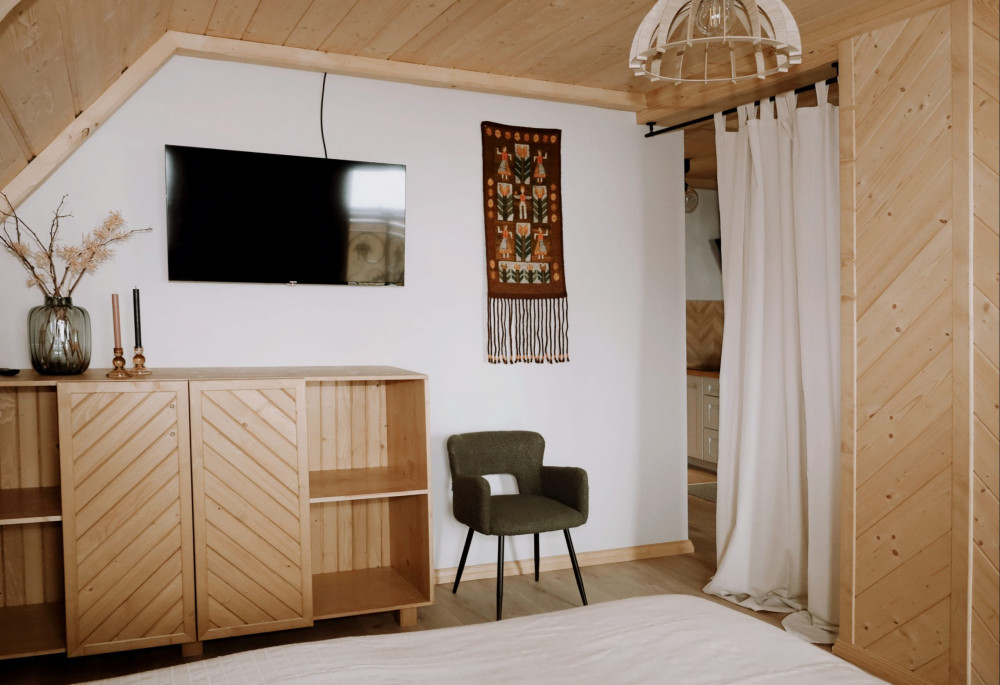 Wnętrze utrzymane jest w ciepłych, naturalnych kolorach. Dominują świerkowe deski oraz meble wykonane własnoręcznie przez gospodarza, co nadaje apartamentowi wyjątkowego, góralskiego charakteru. Idealny dla pary lub singla ceniącego przytulną przestrzeń.