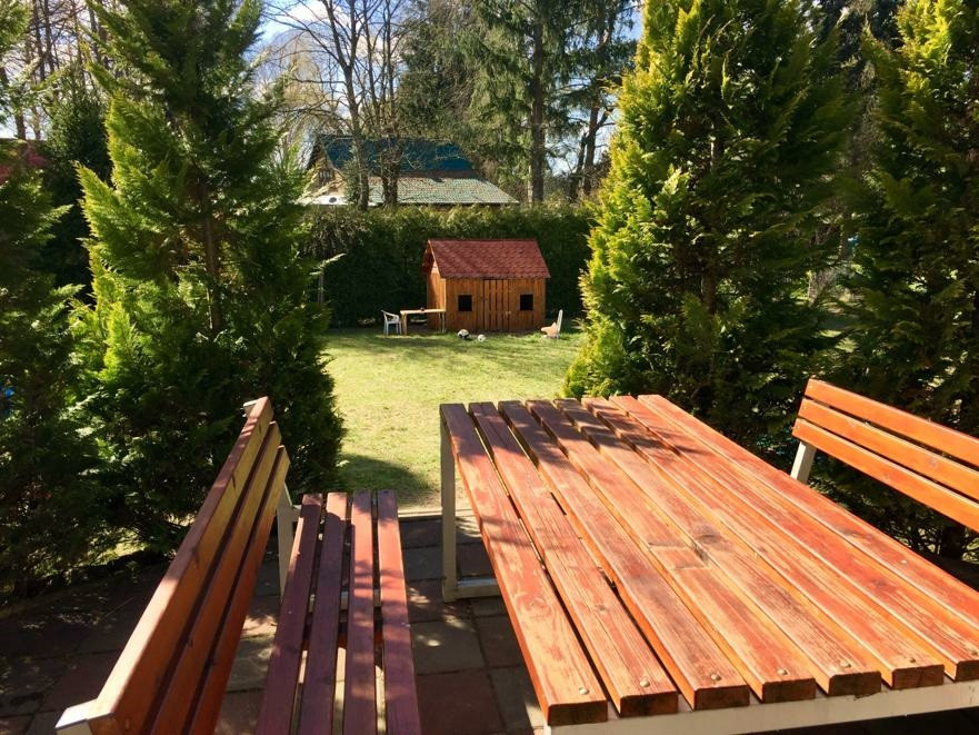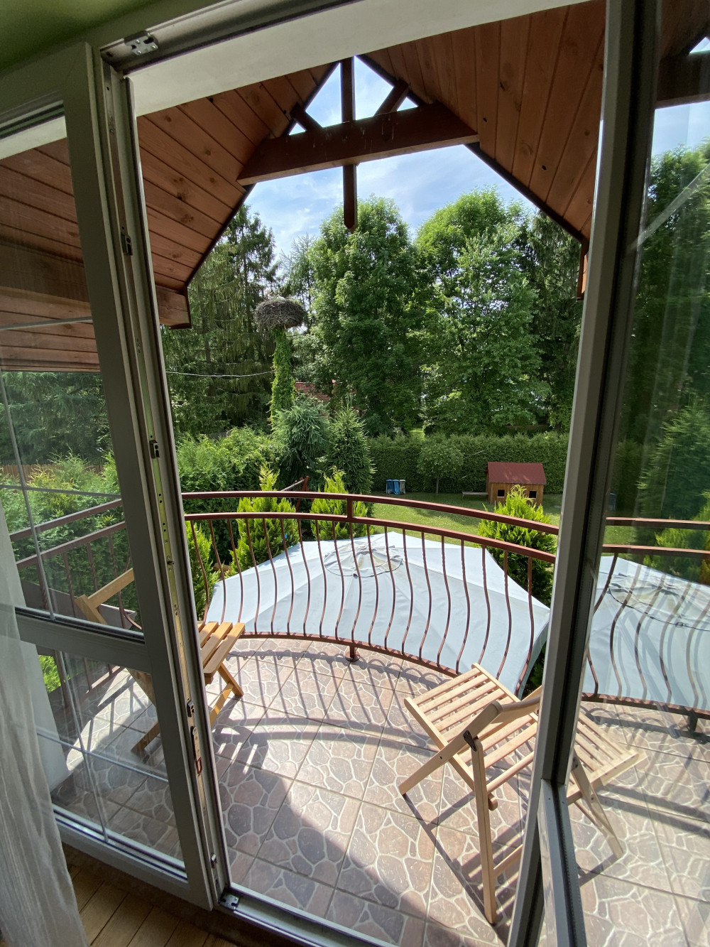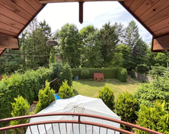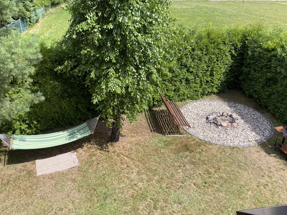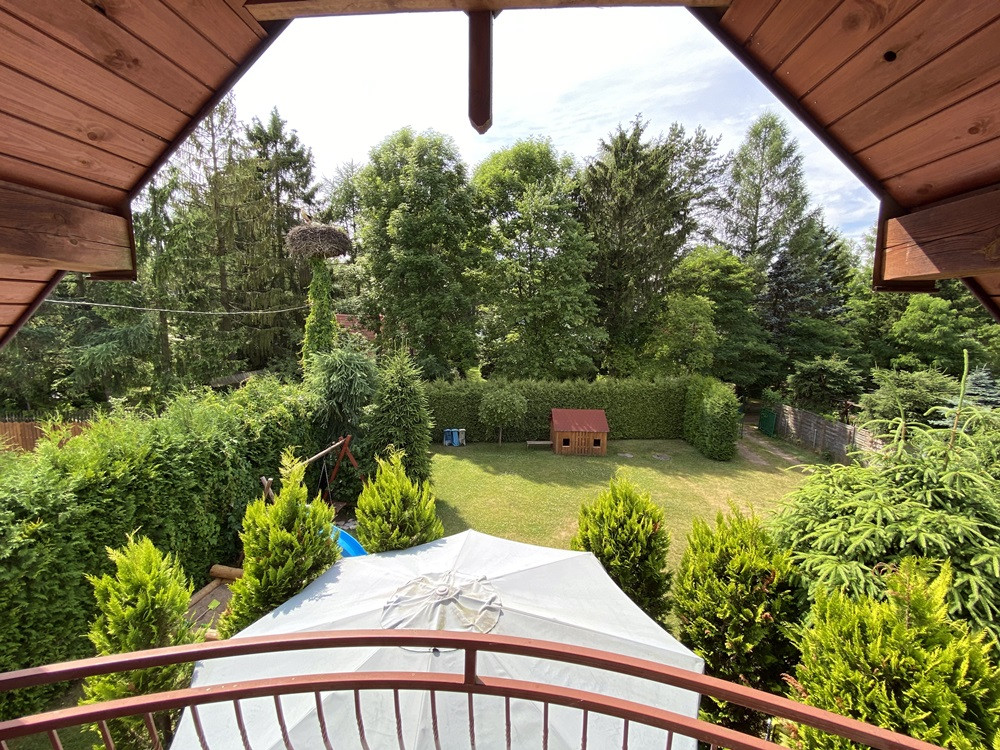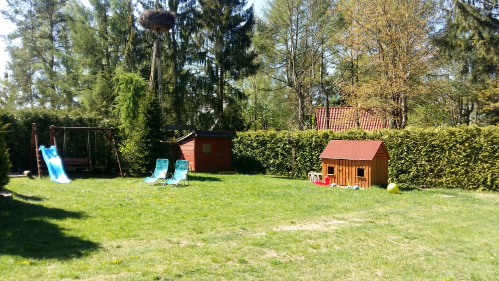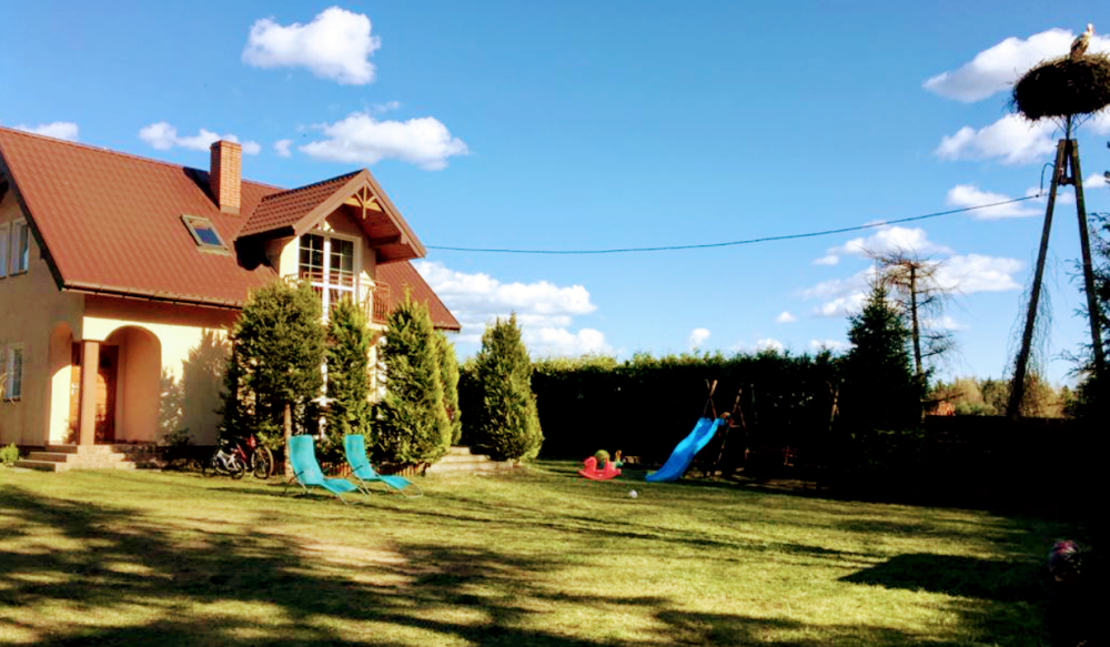 Dodatkową atrakcją jest bocianie gniazdo na granicy działki, które cieszy oczy i dodaje miejscu wyjątkowego uroku.