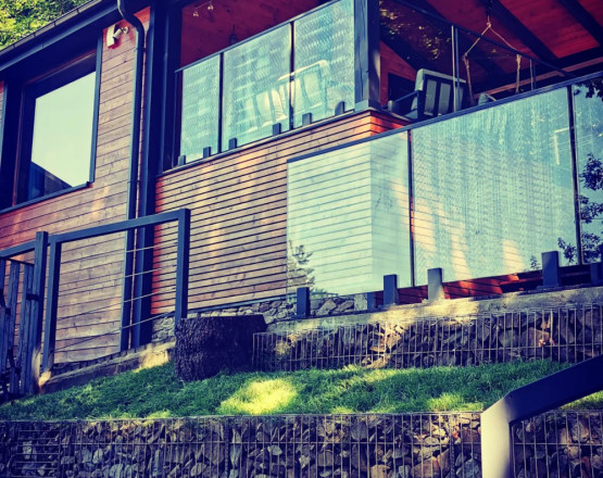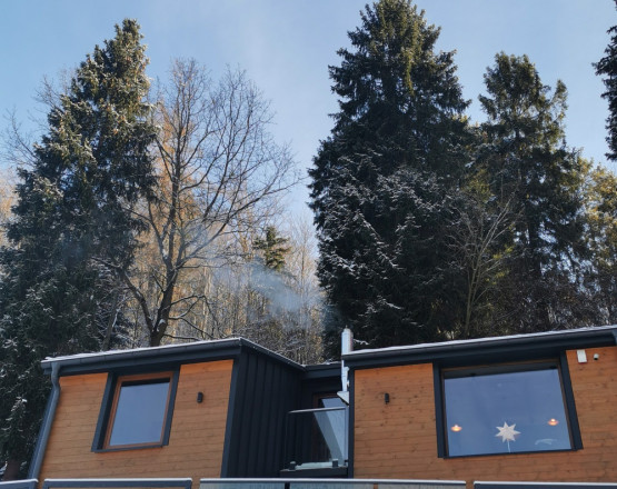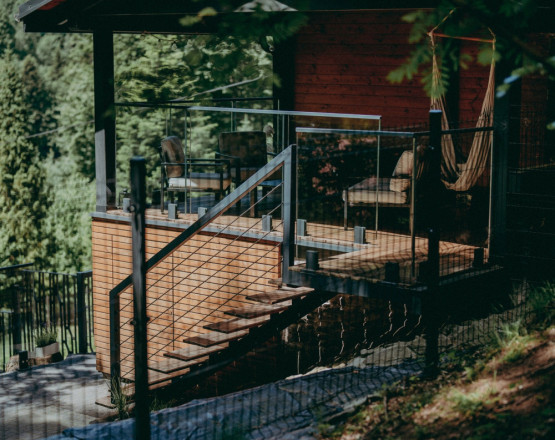 Na zewnątrz domku czeka na Ciebie przeszklony, widokowy taras z komfortowymi kanapami oraz podwieszanym siedziskiem, idealnym do wypoczynku z widokiem na naturę. W ogrodzie przygotowaliśmy dla naszych gości grill oraz hamak, by można było w pełni cieszyć się świeżym powietrzem i spokojem okolicy.