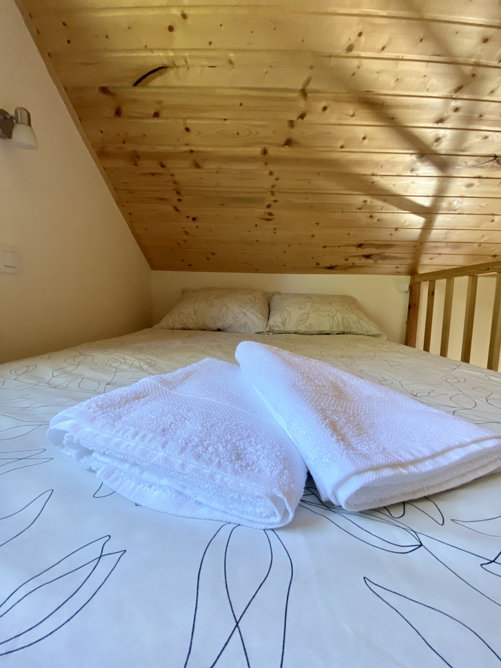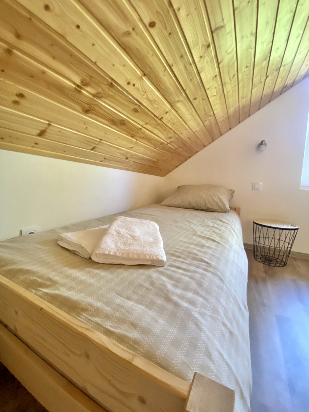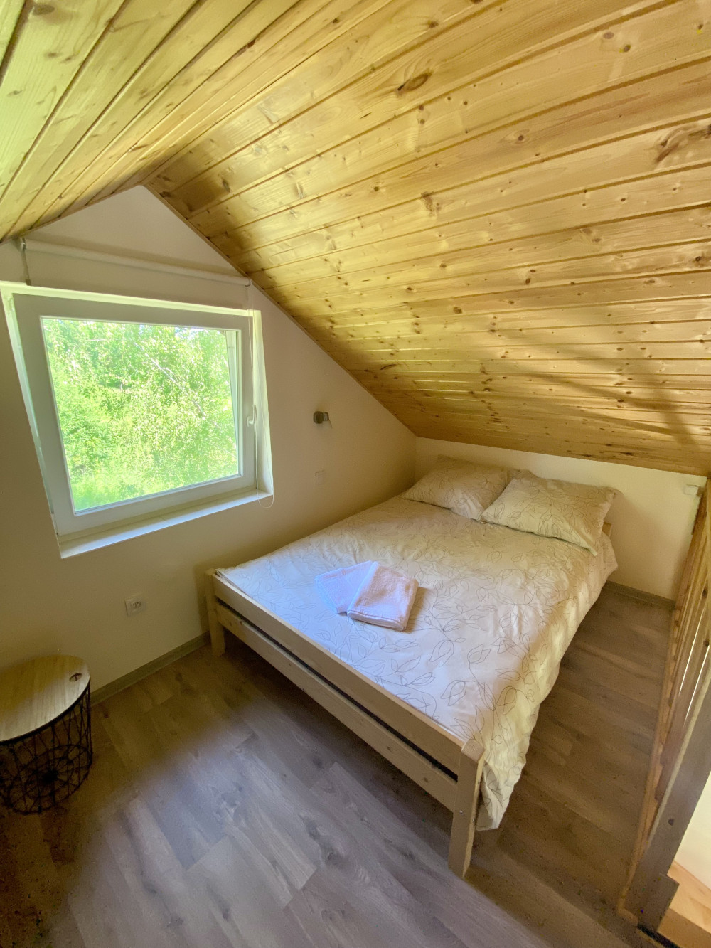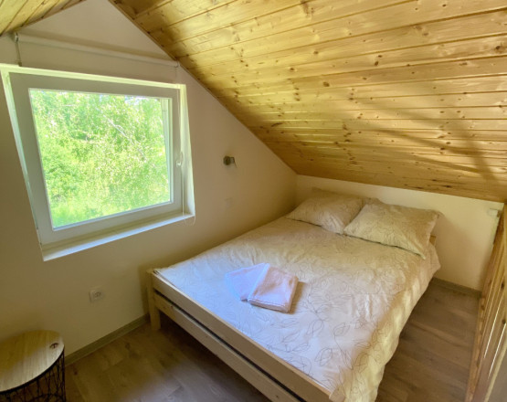 - Drugi domek jakim dysponujemy jest na osobnej posesji. Do dyspozycji gości jest piętrowy domek z 6 miejscami noclegowymi i dwoma sypialniami, które znajdują się na piętrze (w każdej jedno łóżko podwójne oraz jedno pojedyncze). Na parterze domku znajduję się w pełni wyposażony aneks kuchenny, łazienka, kominek i salon z wyjściem na taras. Goście mają również dostęp do grilla, miejsca na ognisko, siatki do gry w badmintona, huśtawki, piaskownicy z zabawkami i dużego ogrodu.