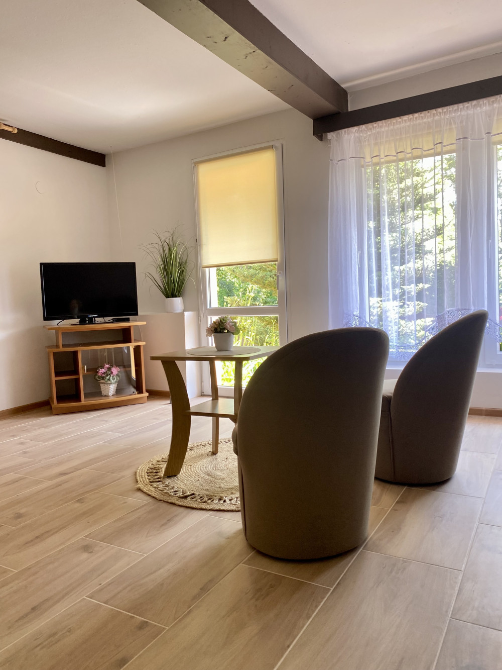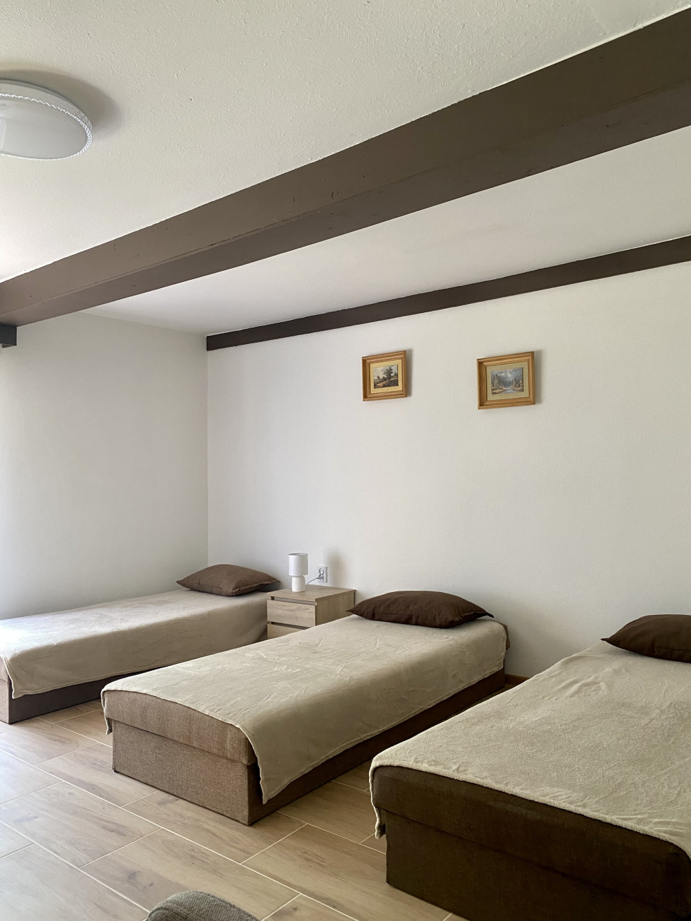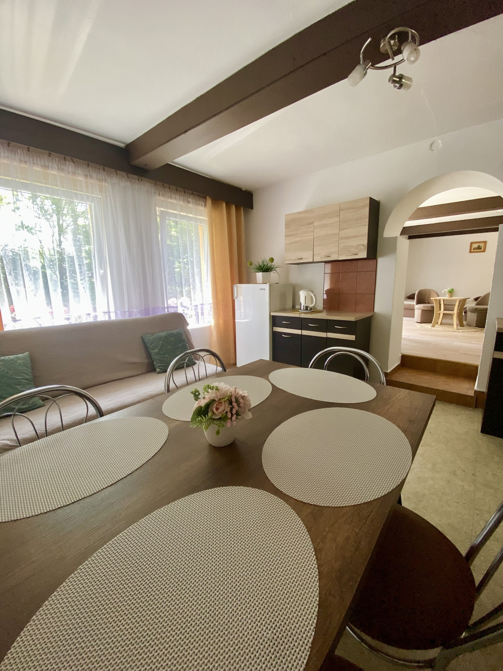 - Drugi domek jakim dysponujemy jest na osobnej posesji. Do dyspozycji gości jest piętrowy domek z 6 miejscami noclegowymi i dwoma sypialniami, które znajdują się na piętrze (w każdej jedno łóżko podwójne oraz jedno pojedyncze). Na parterze domku znajduję się w pełni wyposażony aneks kuchenny, łazienka, kominek i salon z wyjściem na taras. Goście mają również dostęp do grilla, miejsca na ognisko, siatki do gry w badmintona, huśtawki, piaskownicy z zabawkami i dużego ogrodu.