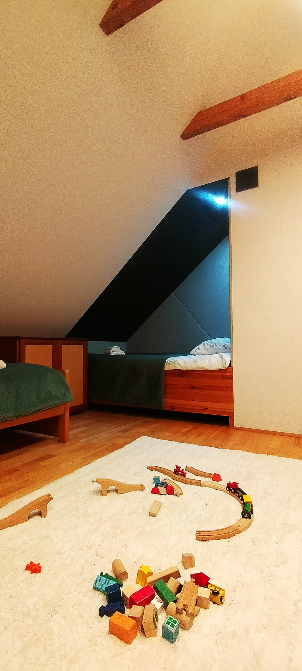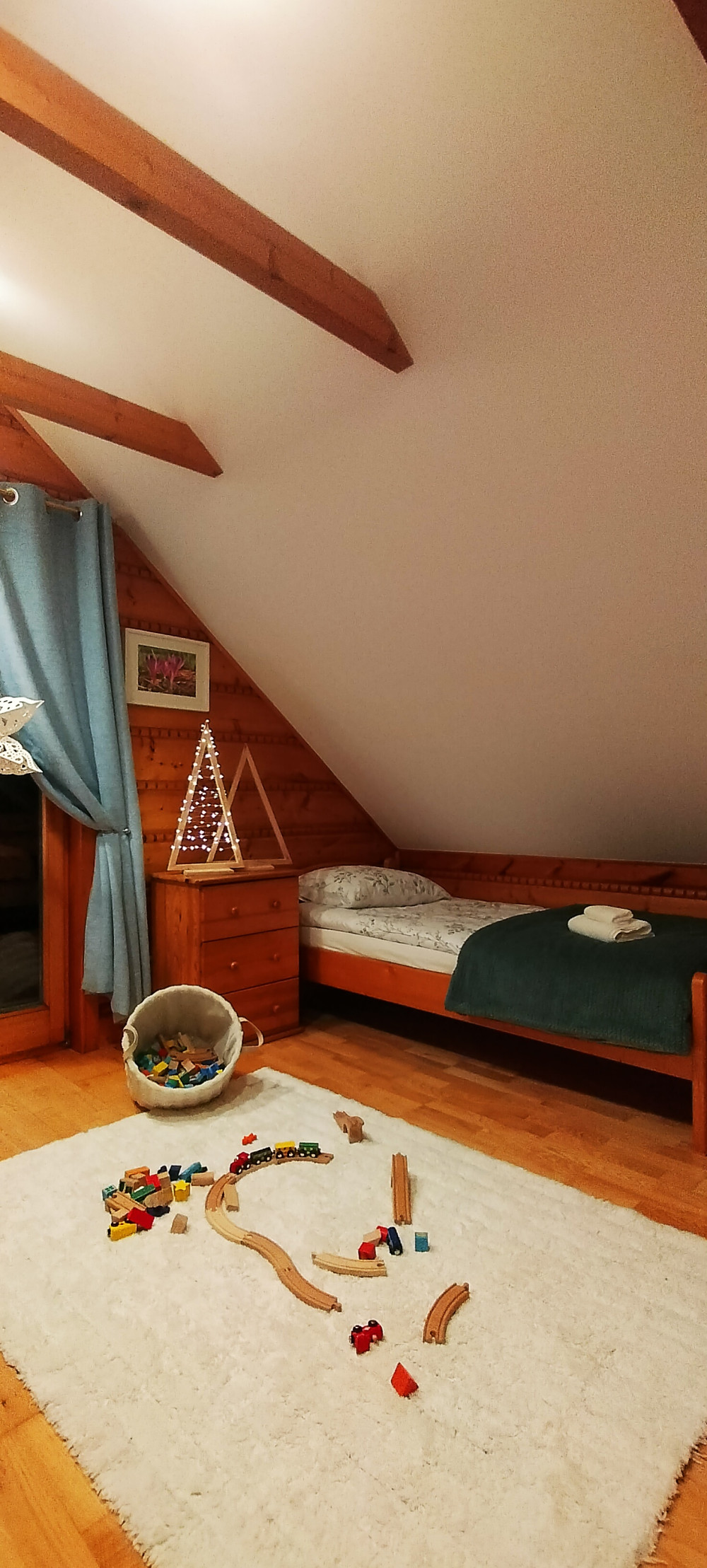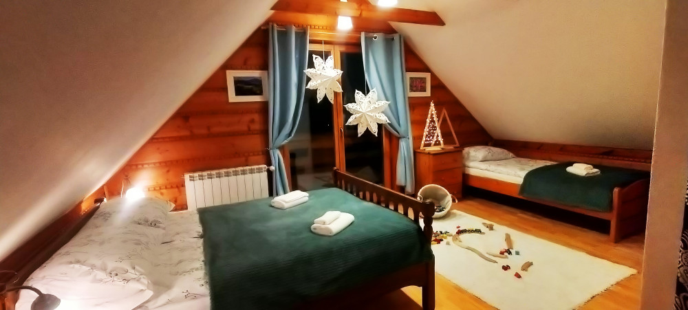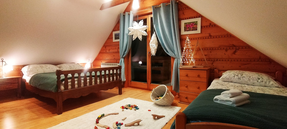Na piętrze znajduje się przestronna sypialnia w formie otwartej antresoli z wyjściem na balkon, z którego można podziwiać górski krajobraz. Do dyspozycji są: łóżko małżeńskie 140 cm, łóżko podwójne 120 cm, łóżko pojedyncze 80 cm oraz rozkładany fotel jednoosobowy.