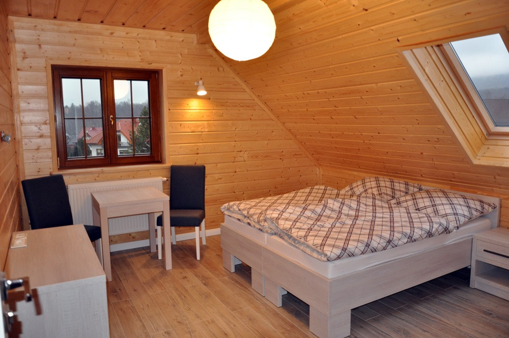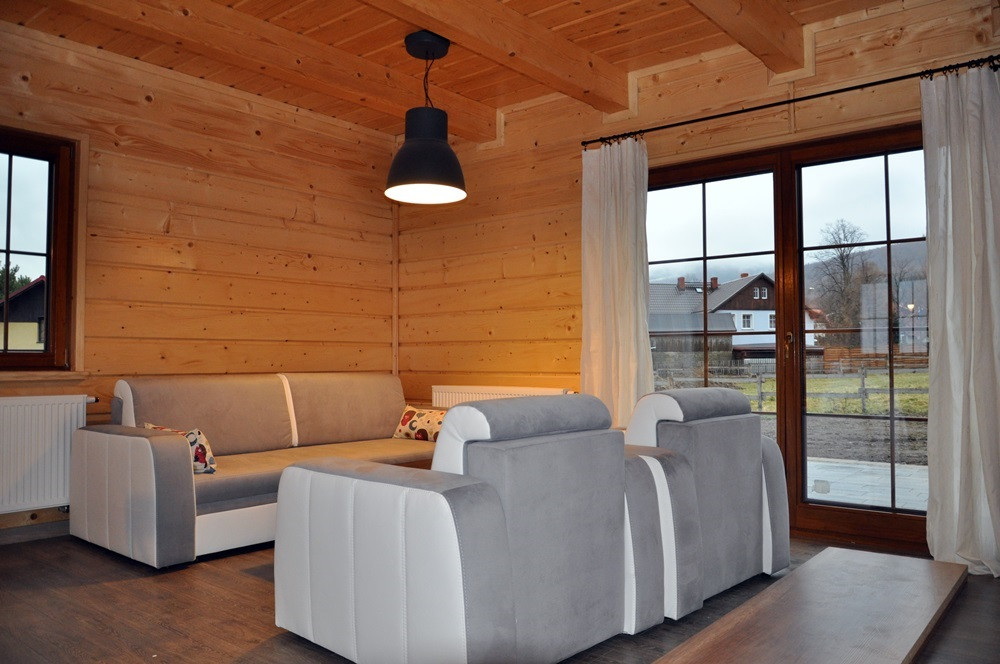 Całoroczny komfortowy Dom z bala w Ścięgnach koło Karpacza to idealne miejsce dla osób szukających wypoczynku w otoczeniu natury, z widokiem na majestatyczną Śnieżkę i pasmo Karkonoszy.