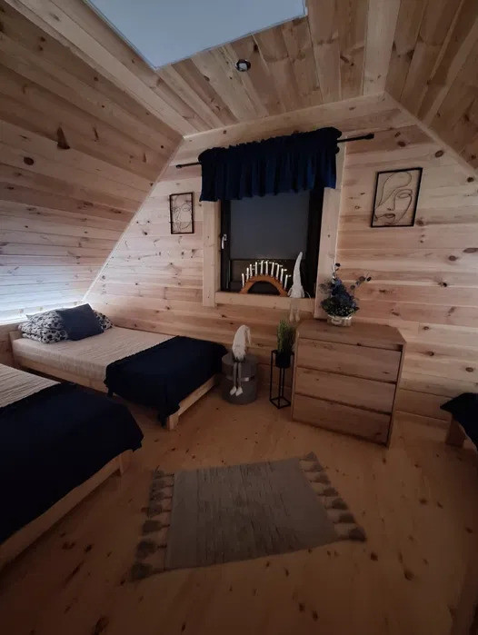 na piętrze dwie sypialnie (po 3 łóżka 90 cm z możliwością łączenia w łoża małżeńskie),