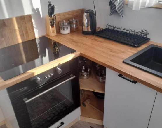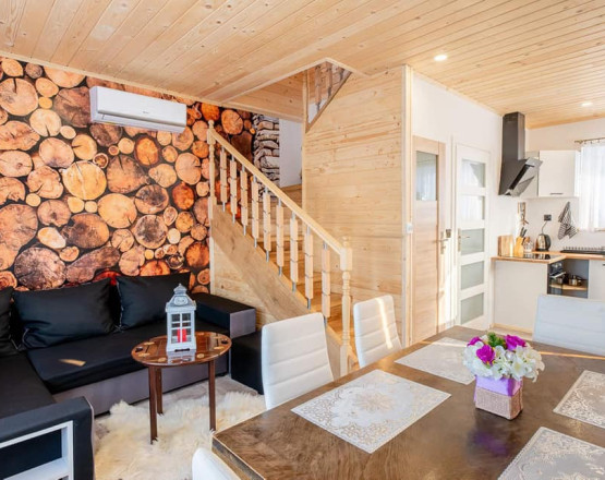 Domek ma około 35 m², ale został zaprojektowany tak, by maksymalnie wykorzystać przestrzeń i zapewnić wygodę Gościom. Do dyspozycji jest: