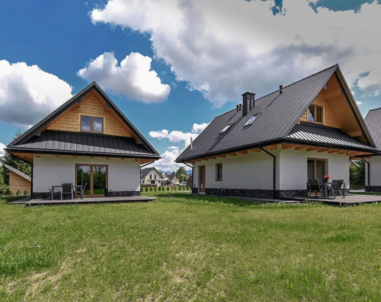 Komfortowe i przestronne domkiKażdy z domków ma 70 m² powierzchni, a przemyślane wnętrza gwarantują wygodę dla 6 osób. W środku znajdują się: