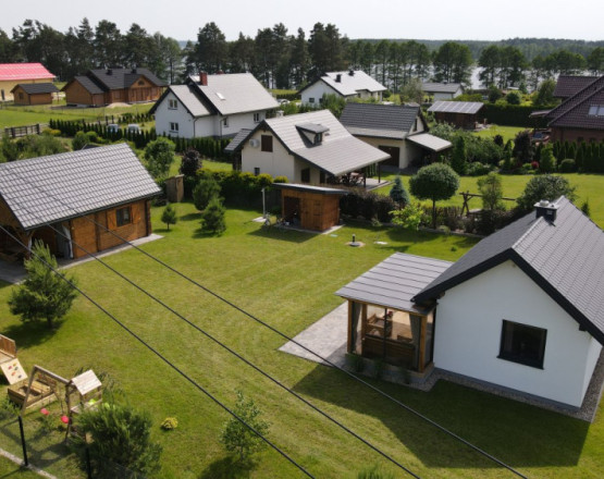 Zapraszamy do nowoczesnych, w pełni wyposażonych domków na prywatnej, ogrodzonej działce, położonych zaledwie 150 metrów od plaży nad Jeziorem Wałpusz. Oferujemy:
