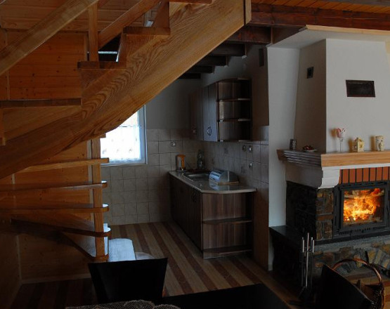 - Parter: salon z kominkiem, telewizor (TV satelitarna), aneks kuchenny (palnik gazowy, lodówko-zamrażarka, komplet naczyń), łazienkę z kabiną prysznicową.