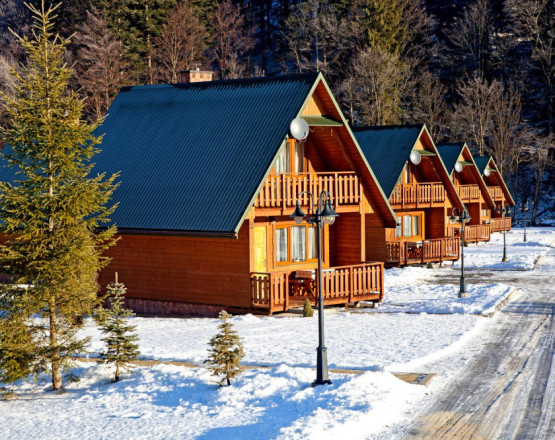 - 8 drewnianych, całorocznych domków wyposażonych w kominki, co gwarantuje ciepłe i przytulne wieczory.
