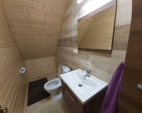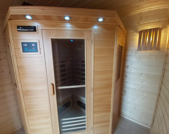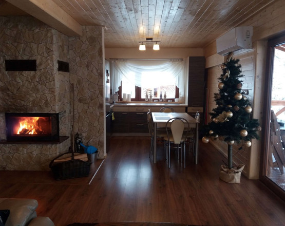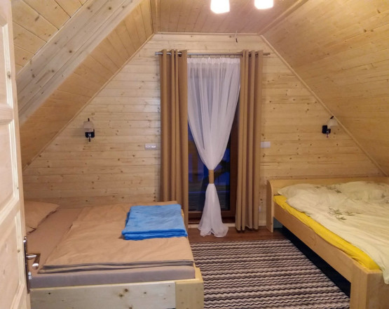 Domek posiada 3 sypialnie na poddaszu. Jedna 4 osobowa, druga 4 osobowa oraz trzecia 3 osobowa z aneksem wypoczynkowym oraz tv. Na poddaszu również wc. Na parterze duży salon z kominkiem, tv, kuchnia w pełni wyposażona (duża lodówka, piekarnik, płyta indukcyjna, czajnik elektryczny, kuchenka mikrofalowa, expres do kawy na kapsułki (dolce gusto)wszystkie niezbędne naczynia), łazienka. Z salonu wyjście na duży zadaszony taras. Z kuchni wyjście na mniejszy taras, na którym znajduje się sauna. W ogrodzie duża altana z kominkiem, gorąca beczka z jacuzzi oraz miejsce na ognisko.