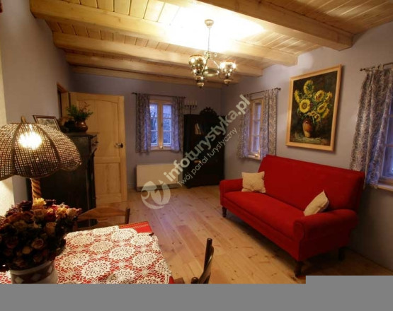 Sypialnia z dużym łożem małżeńskim. Pokój z dodatkowym miejscem do spania i kominkiem jothul. Przestronna łazienka "Słoneczna" z wanną.