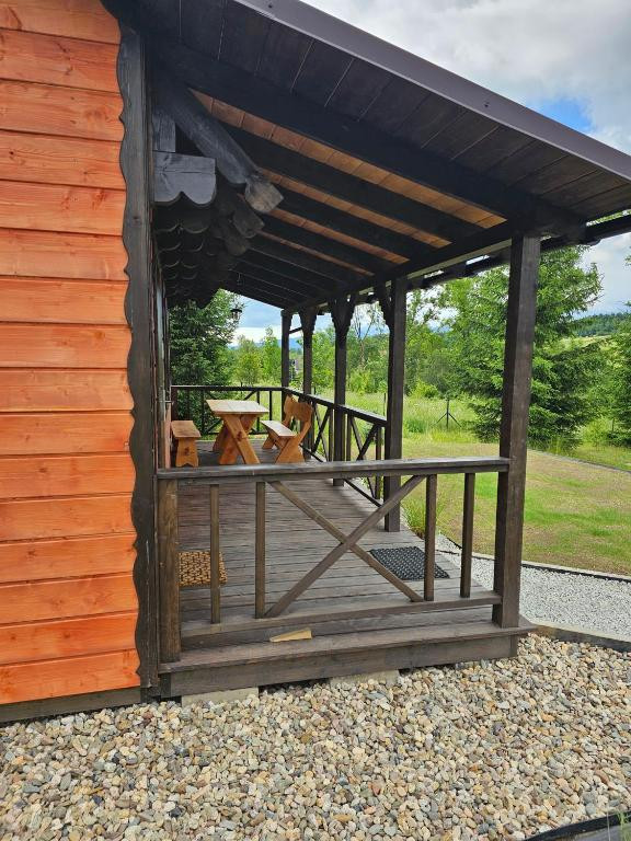 zadaszony taras ze stołem i ławami – idealny na poranną kawę lub wieczorny relaks.