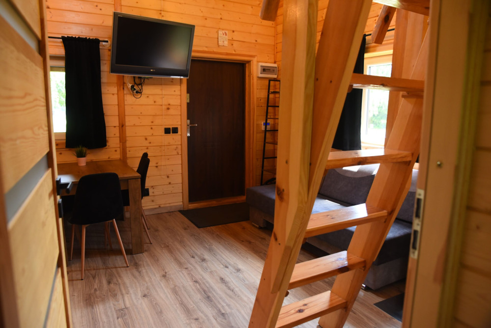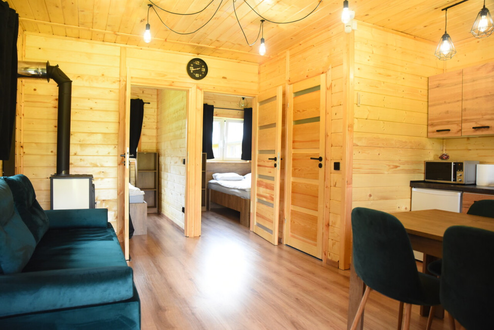 Urządzone są w stylu łączącym nowoczesność z przytulną atmosferą. W każdym z nich znajduje się kominek, rozkładana kanapa, stół z krzesłami, telewizor, lodówka z zamrażalnikiem oraz dostęp do Wi-Fi. Dzięki dużym oknom i bliskości jeziora możesz cieszyć się naturą bez wychodzenia z wnętrza.