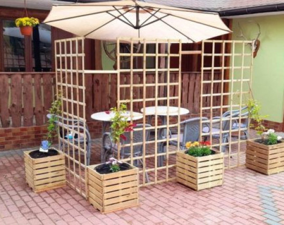 Prywatny ogród z wiatą grillową, paleniskiem i dużym biesiadnym stołem
