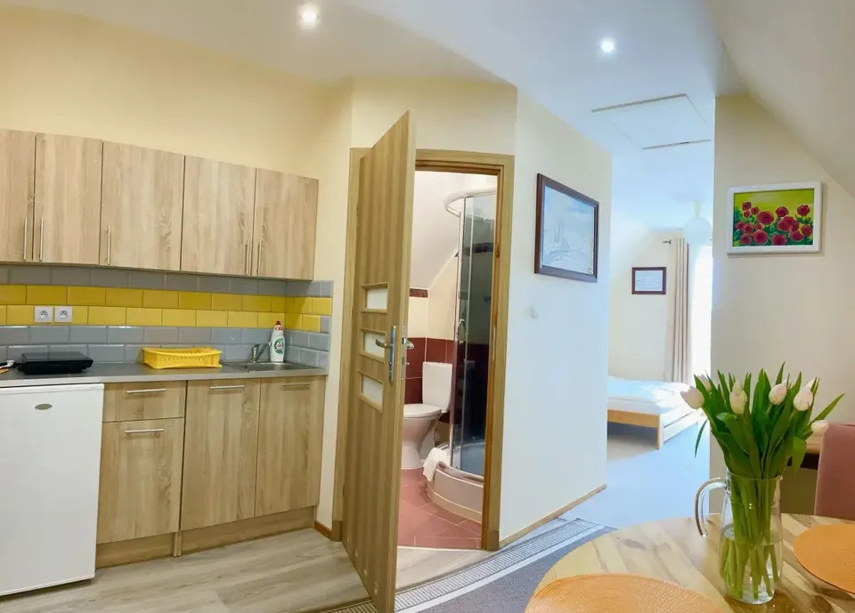 studio czteroosobowe z aneksem kuchennym i balkonem.