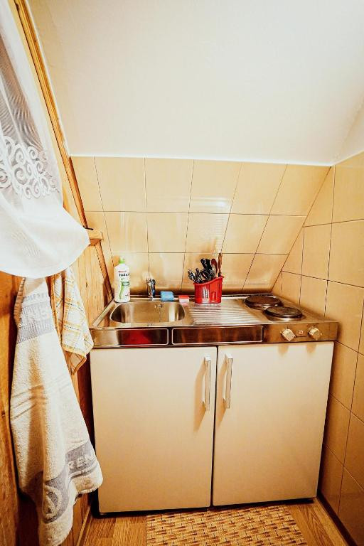 W budynku przygotowano dwa aneksy jadalne wyposażone w płytę grzewczą oraz lodówkę – to wygodne rozwiązanie dla Gości, którzy lubią samodzielnie przygotować posiłki. Dodatkowo istnieje możliwość zamówienia śniadań z firmy cateringowej, co sprawdzi się świetnie zwłaszcza przy porannych wyjściach w góry. Na zewnątrz czeka szałas do grillowania, gdzie można spędzić wieczór przy kiełbasce i rozmowach w gronie bliskich, oraz niestrzeżony parking dla zmotoryzowanych.