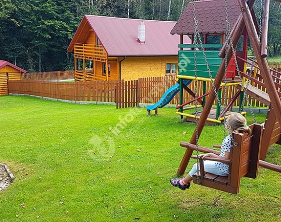 Domki mieszczą się na dużej, ogrodzonej działce kilkanaście metrów od lasu. Błogą ciszę zakłóca tylko piękny śpiew ptaków, szum pobliskiego potoku i cykanie koników polnych, a z okien, ogrodu i tarasu rozpościera się malowniczy widok na góry.