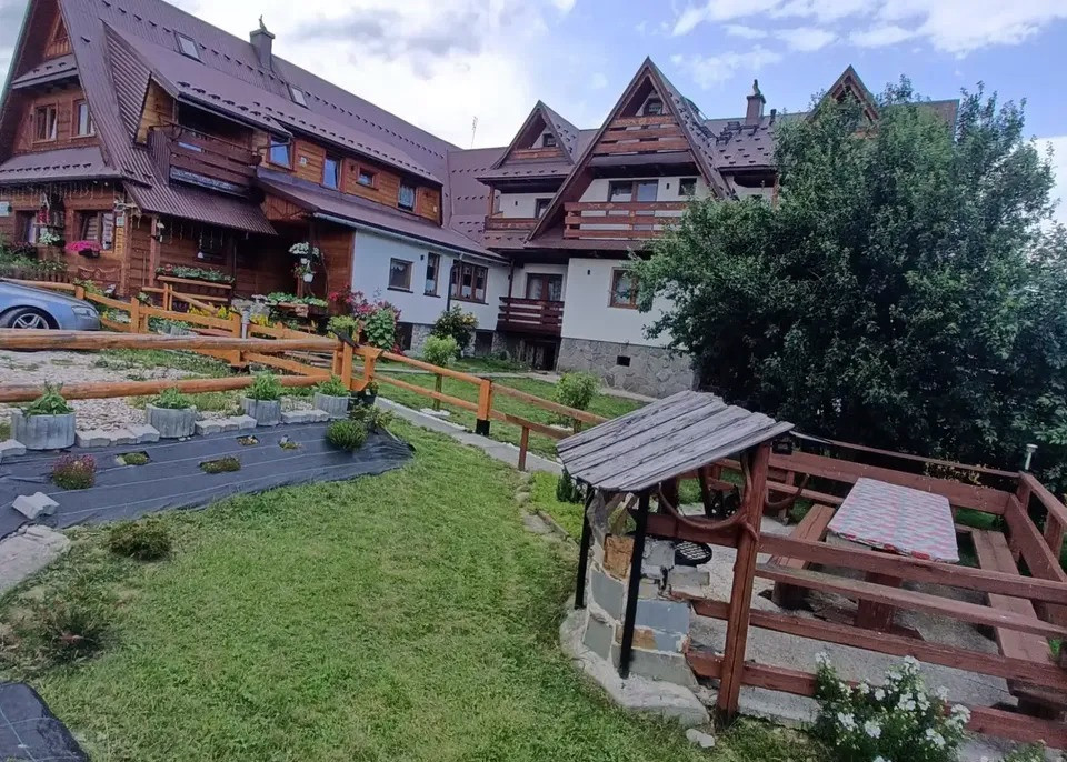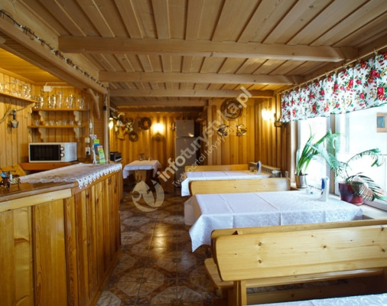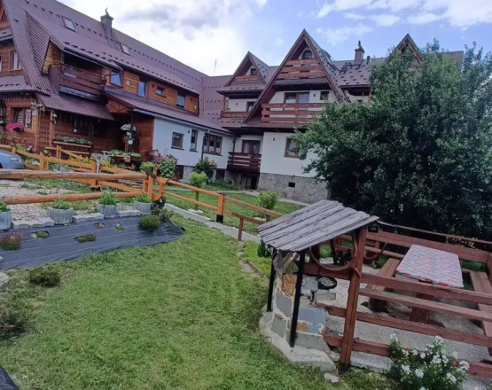 Na parterze znajduje się jadalnia z w pełni wyposażonym aneksem kuchennym lodówkami i mikrofalówką.Na piętrach również aneksy kuchenne Oferujemy także odrębne duże 6 os. dwupokojowe studio rodzinne z łazienką, tv, balkonem i w pełni wyposażoną kuchnią. Z okien pokoi roztaczają się niezapomniane widoki na góry. Nasz dom otoczony jest dużym ogrodem z placem zabaw, grillem i dogodnym parkingiem.