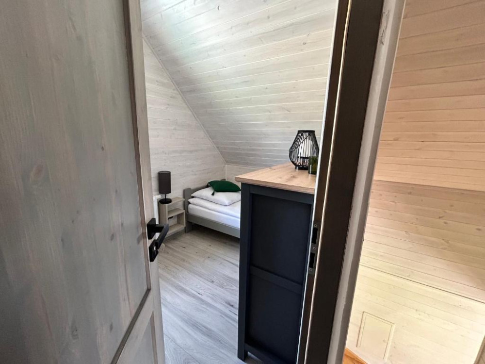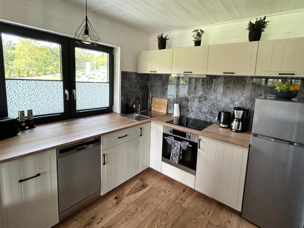 parter: przestronny salon z jadalnią i w pełni wyposażonym aneksem kuchennym (piekarnik, płyta indukcyjna, zmywarka, duża lodówka, czajnik, zastawa stołowa), łazienka z kabiną prysznicową, pralką, ręcznikami i suszarką do włosów,
