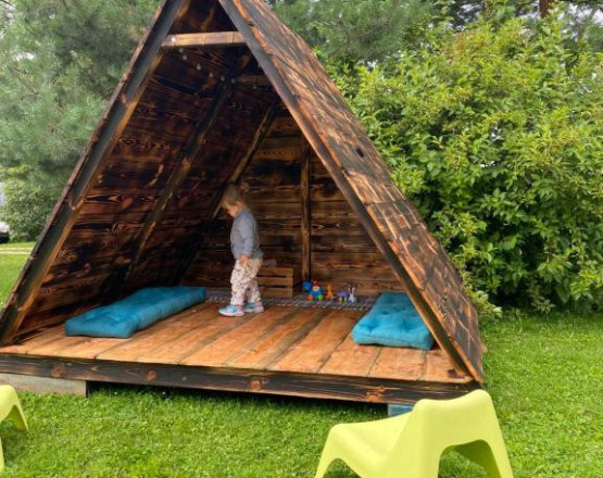 Udogodnienia na terenie: staw z leżakami, miejsce na ognisko, boisko do siatkówki, huśtawka, mały plac zabaw, przechowalnia rowerów, utwardzony parking, Wi-Fi.