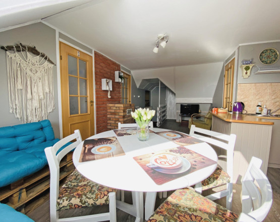 Parter: duży salon z częścią jadalną, kuchnia do dyspozycji gości, kącik TV; wyjście na zadaszony taras.