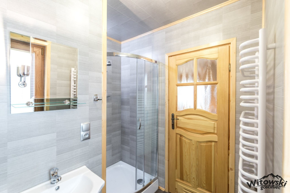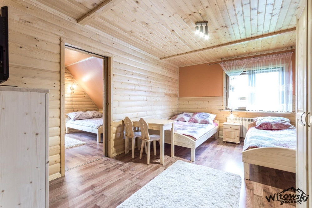 Na piętrze znajdują się cztery nowoczesne pokoje gościnne, każdy z własną łazienką, urządzony w przytulnym, góralskim stylu z nutą nowoczesności. To idealne warunki dla rodzin, par i grup znajomych.