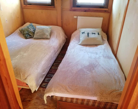 DOMEK DREWNIANY dla 5-6-osób wyposażony w: pokój dzienny z TV, z możliwością spania dla 2 osób, dwie sypialnie 2-osobowa i 3-osobowa, kuchnia z wyposażeniem (kuchenka, lodówka, zmywarka, mikrofalówka, czajnik bezprzewodowy, komplet naczyń); łazienka z natryskiem i wc. Wyjście na zadaszony taras z widokiem na jezioro. Domek jest wyposażony w centralne ogrzewanie (bezobsługowe).