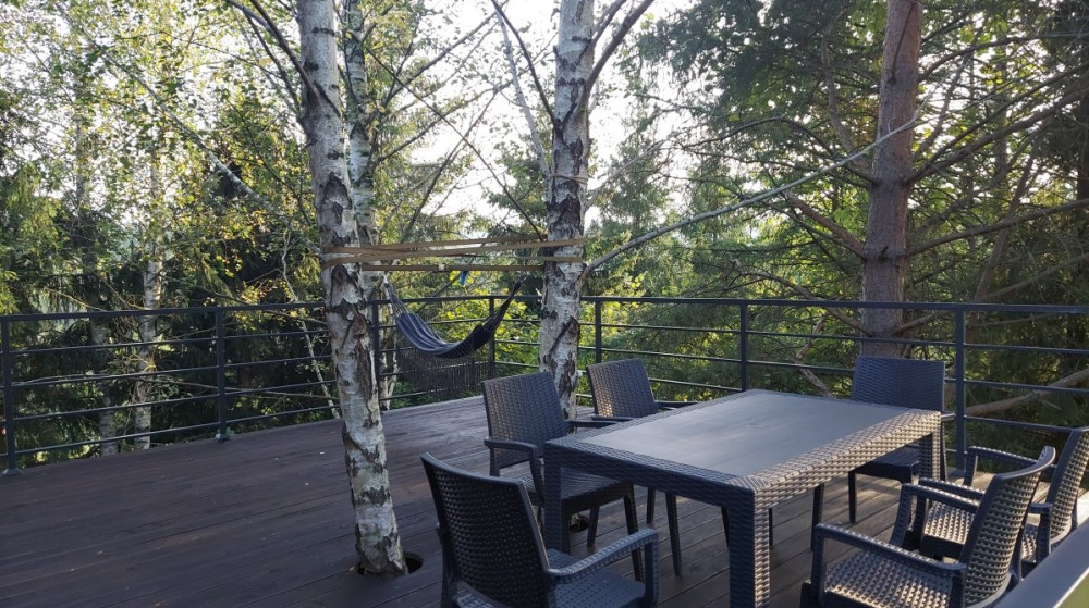 Nowoczesny, piętrowy domek zapewnia komfortowy pobyt dla maksymalnie 5 osób. Otacza go zieleń, a duży taras daje możliwość odpoczynku wśród sosen, brzóz i modrzewi. Dzięki dużej odległości od innych zabudowań, możesz cieszyć się prywatnością i ciszą.